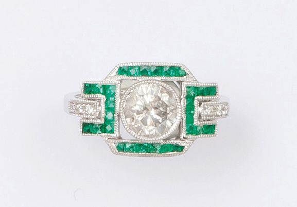 set with a brilliant-cut diamond calibrating a carat plating smaller diamonds and emeralds calibrated. Ring size: 53. P. 4.8g