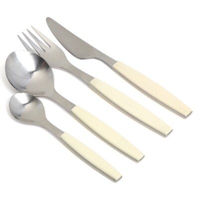 Stainless steel cutlery, with white plastic handles
