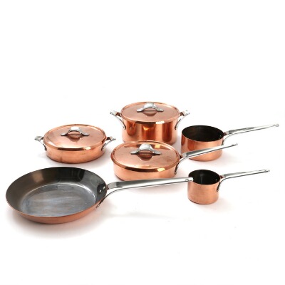 A set of copper saucepans with steel handles, insides with silver overlay.