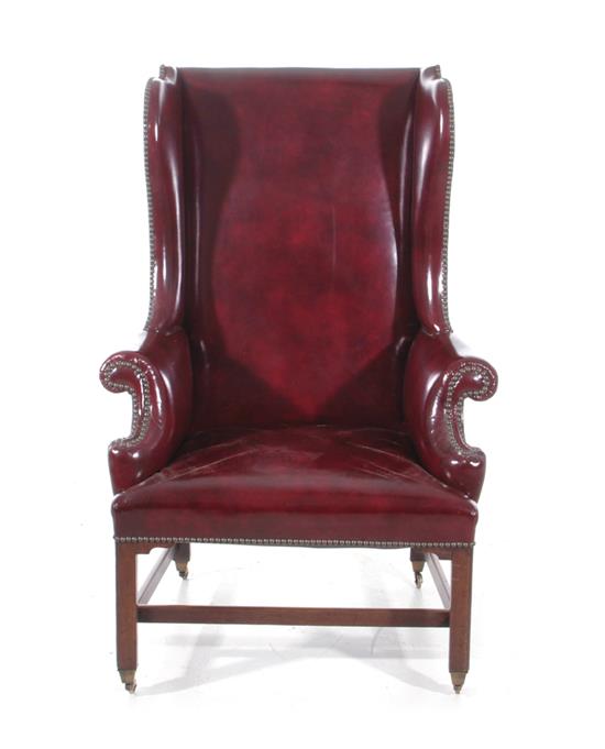 George III leather upholstered wingback chair circa 1810, nailhead tacked arched frame and wings leading to scrolling arms and square legs joined by stretchers, BH50 1/4" SH18 1/2" W33" D27"