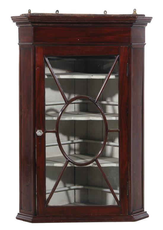 George III mahogany hanging corner cupboard late 18th century, molded cornice over seven-light door opening to painted shelves, on molded base; H38 1/4" W26 1/2" D16 1/4"