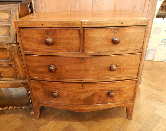 of two short and two long graduated drawers, with wooden handles, raised on splayed bracket feet