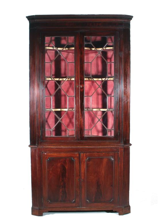 Georgian mahogany corner cabinet circa 1800, dentil-molded canted cornice, pair eighteen-light doors, lower part with cupboard doors, bracket base; H87 1/4" W42 1/2" D23"
