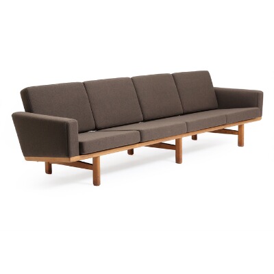 Four-seated sofa with oak frame, loose cushions with brown wool.