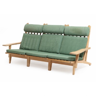 A solid oak three-seater additional sofa, loose cushions upholstered with green patterned wool.