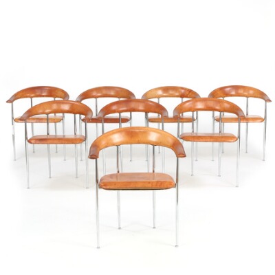 Set of eight armchairs with chromed steel frame. Upholstered with patinated natural leather.
