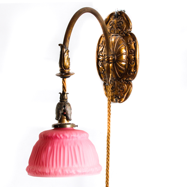 Gilt bronze wall hanging light sconce with molded drape design pink satin glass shade