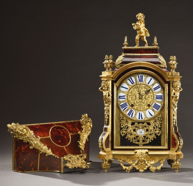 Grand Cartel and console in tortoiseshell veneer and ornamentations of gilt bronze, dial with blue enamelled cartridge marked: Claude Raillard Paris.