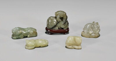 Group of five Chinese carved jade animals: recumbent ram, together with four various cats; 19th Century and earlier; L: 2" (largest); the ram with wood stand