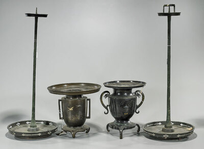 Group of four Japanese bronzes, including: two sectional vases, one showing figural architectural landscape, the other featuring cranes in flight amid stylized waves; together with pair of candlesticks, each with slight openwork detailing to circular