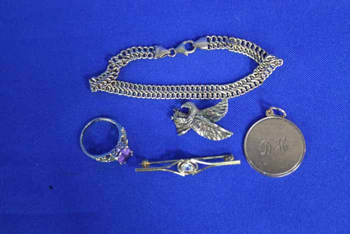 comprising of a bracelet, an amethyst ring, a heart shaped cz brooch, a circular pendant, and an eagle shaped pendant