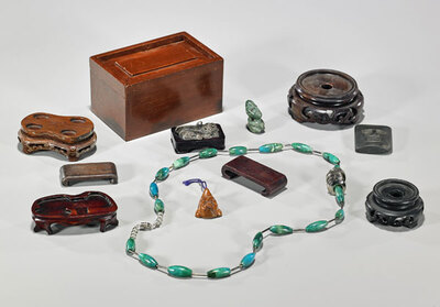 including: Southeast Asian silver animal, of recumbent form, atop a wood stand; Japanese carved wood miniature mask, pending from blue string; green hardstone necklace, possibly chrysoprase; carved stone mask, with simple facial features; carved hard