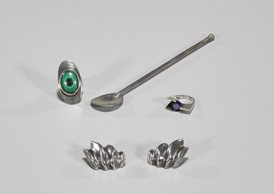 Group of five various metal pieces, including: pair of Mexican sterling silver ear clips, each of swirl-form, one stamped MEXICO / 925 to back; sterling silver and oval-form malachite ring, stamped DESIGNWISE/ MARLER / STERLING to back; white metal a