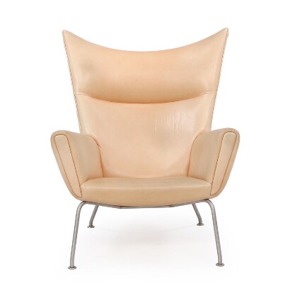 Easy chair with steel legs. Upholstered with light coloured leather.