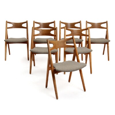 “Saw horse chair”. Seven oak side chairs with grey wool in seats. Model CH 29. Designed 1952. Manufactured and marked by Carl Hansen & Son, Odense. (7)