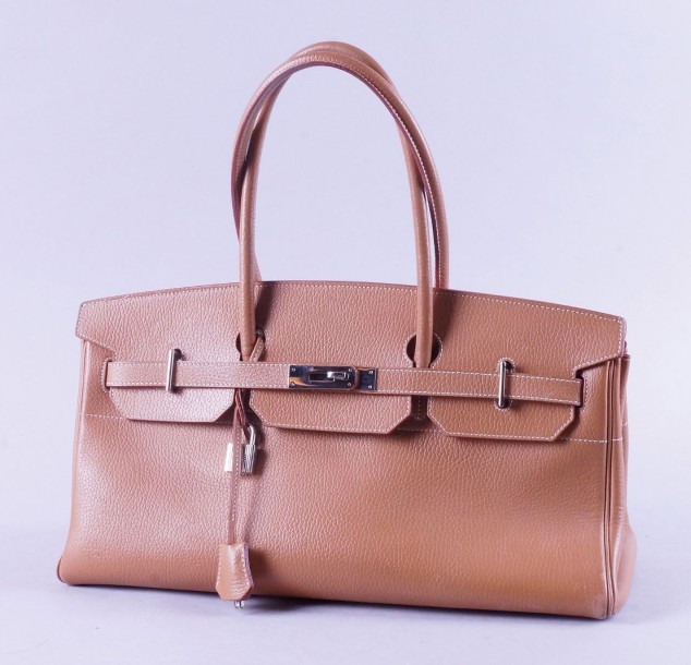 SAC ÉPAULE modèle «Birkin Shoulder» en taurillon caramel avec cadenas, clés et clochette. Intérieur cuir et daim. (Petites éraflures aux angles). Année 2005 (lettre-date I dans un carré). Porte la réf. «15R». 23 x 41 x 15 cm