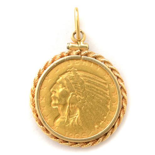 Featuring one 1909 Liberty Indian head $5 gold coin, framed in a 14k yellow gold rope link mounting, completed by a bail. {Gross Weight: 7.1 dwts}