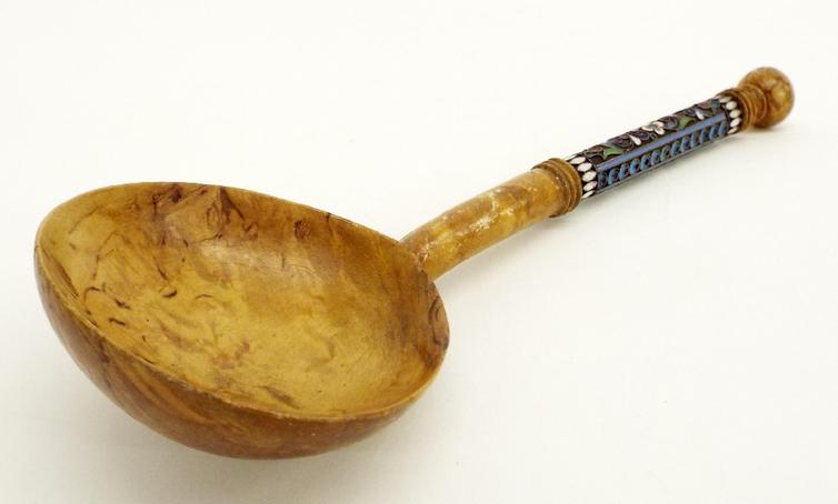 Interesting carved Russian fruitwood ladle with decorative enamel band