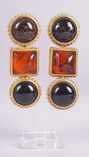 PAIRE DE PENDANTS D'OREILLE en métal doré et résine façon aventurine, ambre et onyx. H.: 8 cm