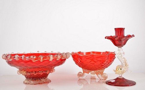 Italian moulded ruby glass bowl, crimped rim with aventurine flex, diameter 23cm, a similar bowl with scrolled feet and a candlestick with a dolphin column, (3).