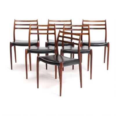 A set of six rosewood chairs, seats upholstered with black imitated leather