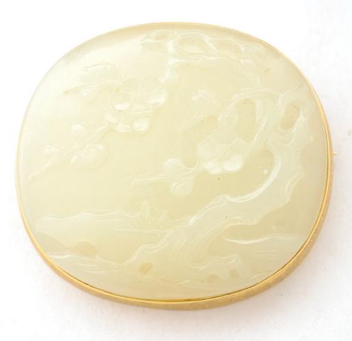 Featuring one carved oval jade segment measuring approximately 43 x 48 mm, depicting a cherry blossom tree scene, framed and set in a 14k yellow gold brooch mounting. {Gross Weight: 19.8 dwts}
