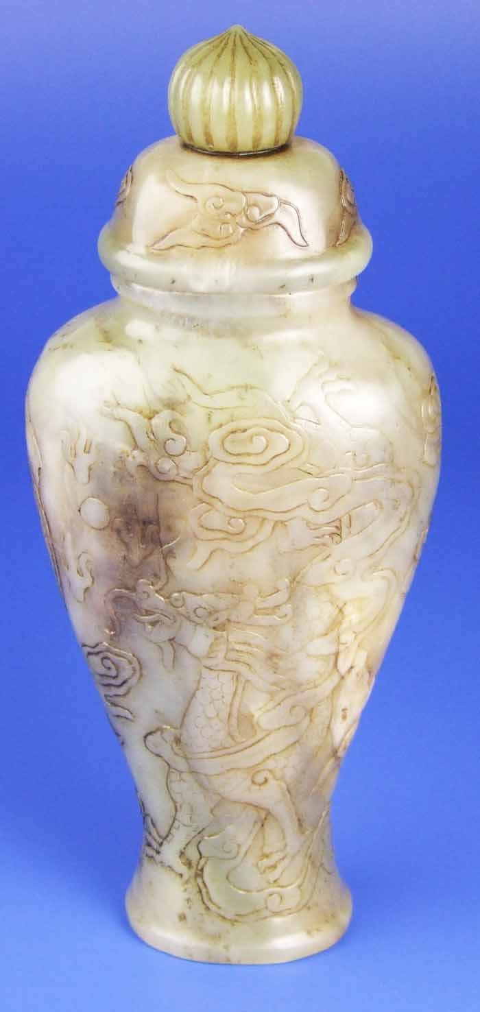 jade vase and cover, the cover with gadrooned finial, the tapered rectangular body with rounded edges, carved with dragons
