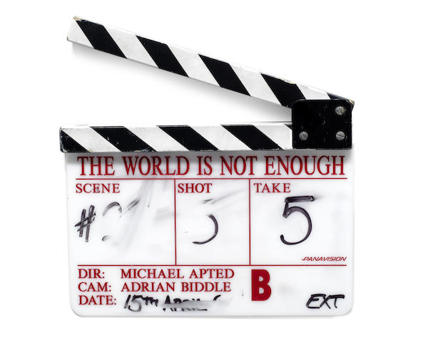 Eon Productions, 1999, plastic board with wooden arm, take number 5 inscribed in black ink, the scene and shot numbers are indistinct, with the film title, Director [Michael Apted], Cinematographer [Adrian Biddle], names in red lettering, accompanied