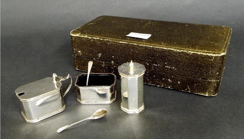 Mid 20th century silver cased cruet set comprising lined mustard and salt and pepper of square faceted form