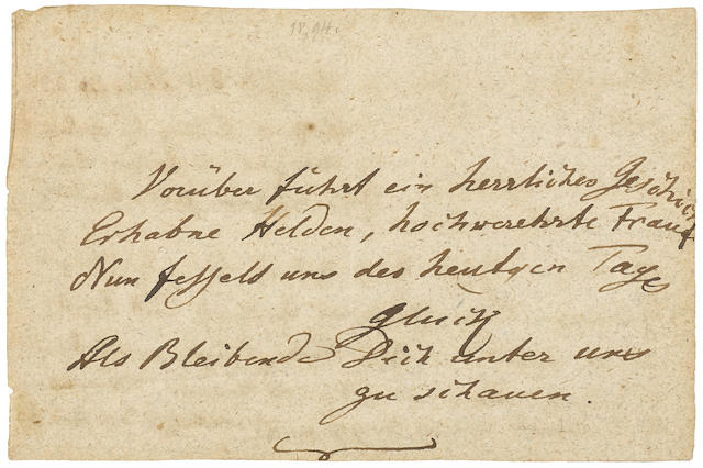 Autograph Quatrain, oblong 8vo, n.p., [January 30, 1814?], mild toning, with manuscript authentication and history by Edmund Kräuter on the verso. Provenance: Sotheby's, May 9, 1985, lot 302.