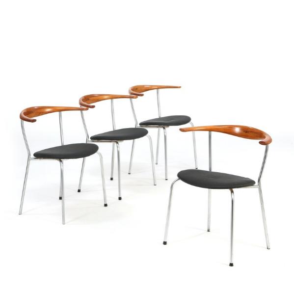 "JH-701". A set of four armchairs with frame of chromed steel, back of oak