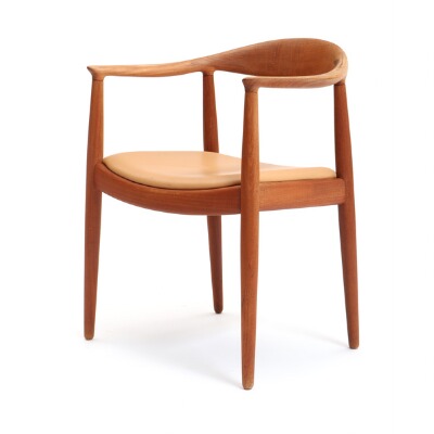 “The Chair”. Armchair of teak. Seat upholstered with light natural coloured leather