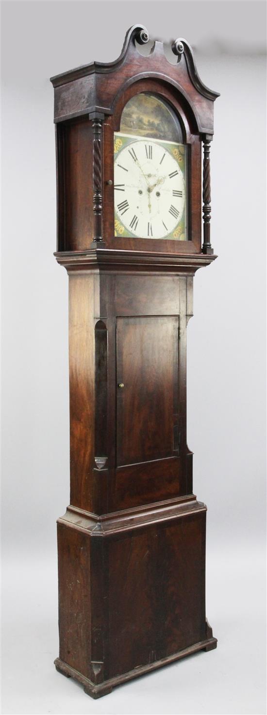 John Blaylock of Carlisle. A William IV mahogany eight day longcase clock, the 14 inch painted arched dial decorated with a scene of cattle drovers, 7ft 4in.
