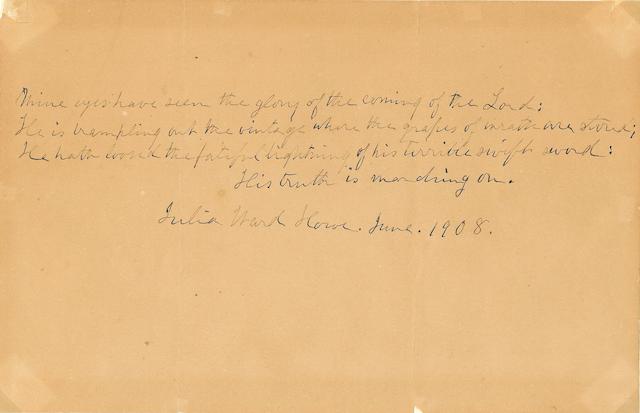 Autograph Quotation Signed ("Julia Ward Howe"), the first verse of The Battle Hymn of the Republic, 1 p, oblong 4to, n.p., June, 1908, even toning. Matted and framed.