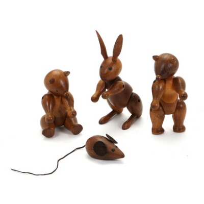 Four wooden toy figures of resp. oak, beech and pine