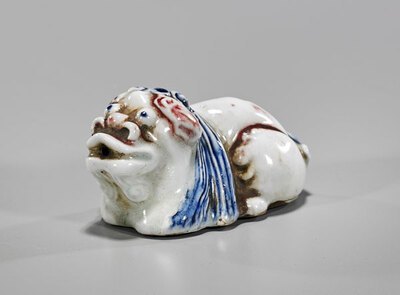 Korean glazed porcelain waterdropper; of recumbent animal-form; showing red and blue accents to face and body; L: 4" (approx.)