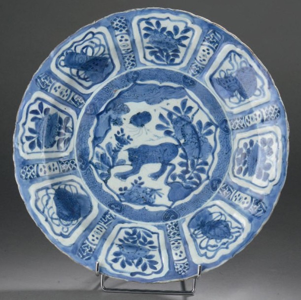 Kraak dish in white porcelain decorated in underglaze cobalt blue of a chimeric animal in the center and flower bouquets radiant