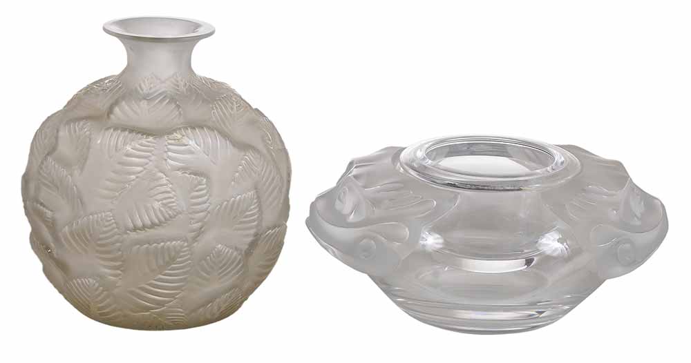 French, 20th century, [Olga frosted-to-clear glass coupe caviar dish, removable liner, base marked "Lalique France", 3-3/4 x 8-1/16 in.; [Ormeau frosted glass vase, base marked "R Lalique France" in script and "26/984", 6-3/4 in.