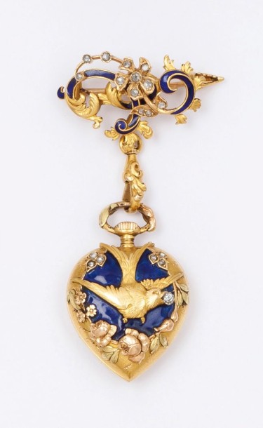 Lapel pin and watch "heart" engraved yellow gold and blue enamel scroll decor