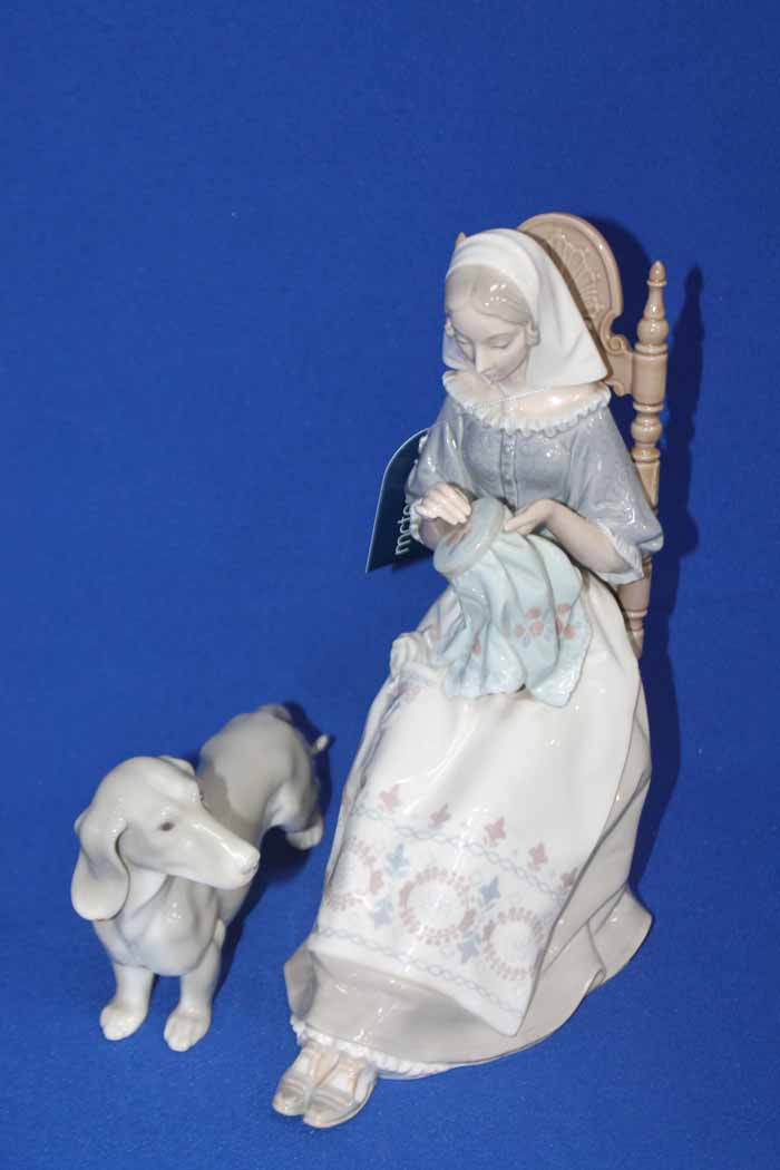 LARGE LLADRO FIGURE modelled as a girl doing embroidery resting on a chair