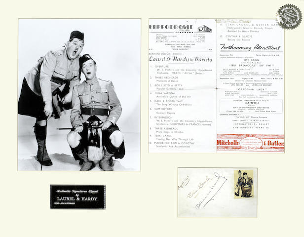 signed in black ink by Stan Laurel and blue ballpoint pen by Oliver Hardy, with a cartoon image of the pair, inscribed in black ink by an unknown hand August 1947, measuring 13 x 8cm (5 x 3in); together with a Hippodrome Theatre programme for Laurel