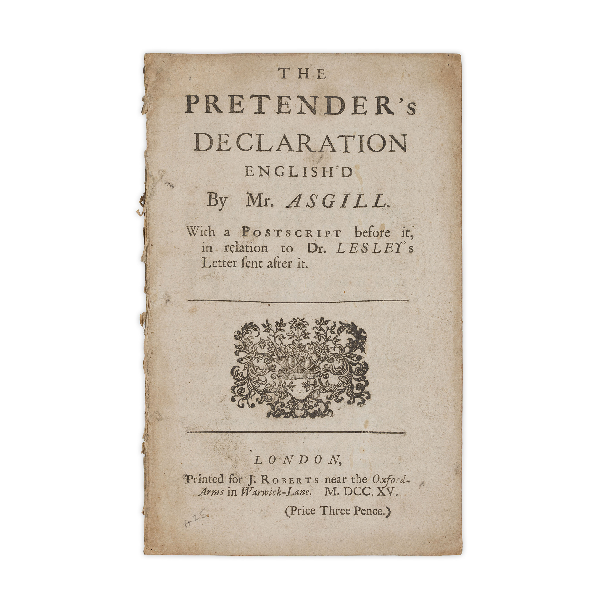 The Pretender's declaration. London, 1715. 8vo, disbound; Hyde, Laurence, Ist Earl of Rochester Three receipts on a single sheet of sums from Thomas Jackson and Hon. M Godolphin, signed ffran. Burkhead, (?), 1677 (2)