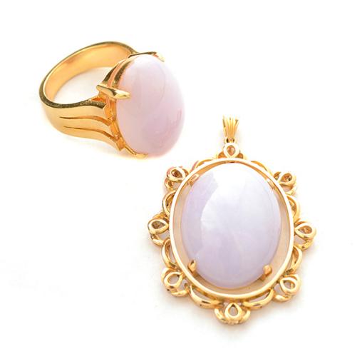 Including one oval lavender jadeite cabochon, 18k yellow gold articulated pendant together with an oval lavender jadeite cabochon, 14k yellow gold ring, size 6 3/4. {Gross Weight: 16.3 dwts}