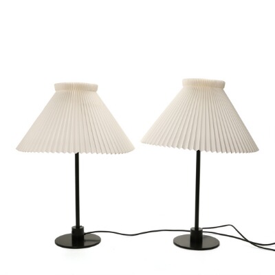 A pair of table lamps of black lacquered metal with pleated paper shades