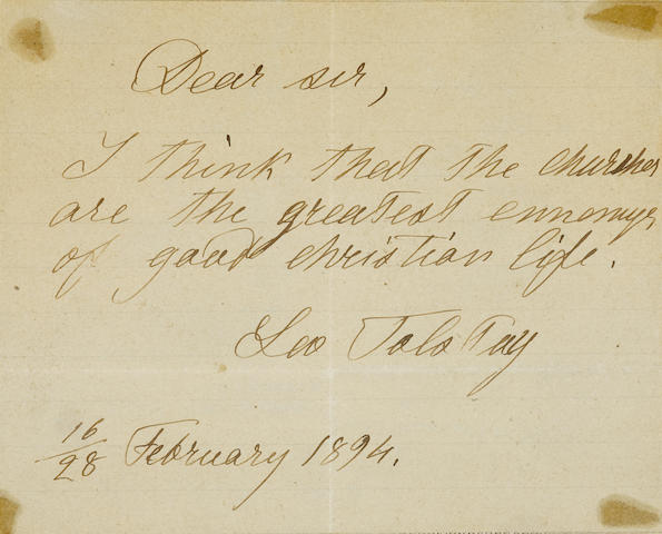 Autograph Note Signed ("Leo Tolstoy"), 1 p, oblong 12mo, n.p., 16/28 February, 1894, in English, mounted at 4 corners to linen mat. Framed with portrait.