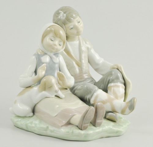 Lladro group of a seated boy and girl with puppy