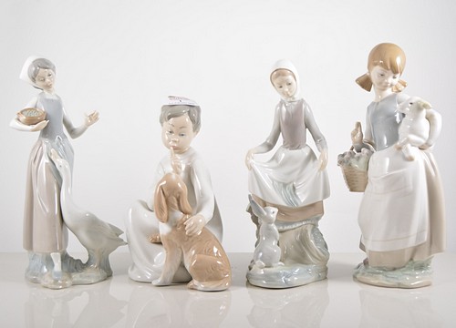 Lladro porcelain model, Boy with a Dog, height 20cm and three other Lladro figure and animal groups, (4).