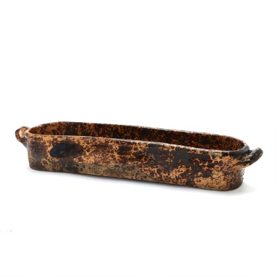 Loaf fired clay basin with “pearl” bronish glaze. Sweden? /England? 19th century. L. 68/75 cm. W.16 cm.