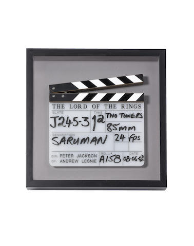 New Line Cinema, 2003, plastic board with a wooden arm, marked with the slate number J245-3, the roll number A158, take 1a, and the description Saruman, date 08/06/02, handwritten in black ink; with the film title, Director [Peter Jackson], Director