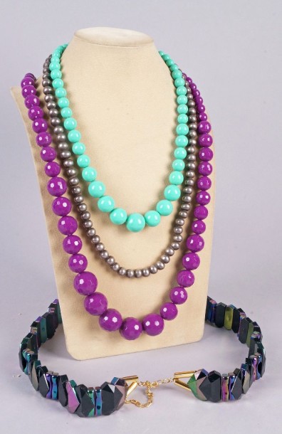 LOT DE TROIS COLLIERS et UNE CEINTURE en bakélite et métal argenté.